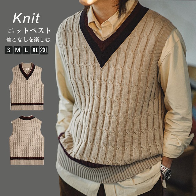 ニットベスト Vネック 無地 メンズ カジュアル セーター プルオーバー ベスト ケーブル編み 配色 大きいサイズ ゆったり カジュアル 春 秋 冬 通学 通勤 ニットトップス おしゃれ かっこいい 送料無料