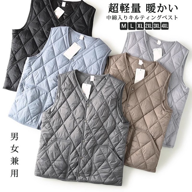 キルティングベスト メンズ レディース インナー ノーカラー キルティング 中綿 無地 薄手 軽量 前開き ポケット付き トップス カジュアル 暖かい ゆったり 保温 撥水 防寒 防風 秋冬 シンプル ベスト ユニセックス おしゃれ 送料無料