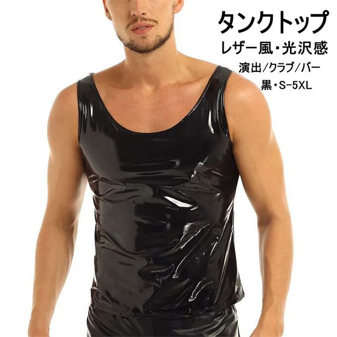 タンクトップ メンズ 袖なし ノースリーブ レザー風 光沢感 PVC 演出 舞台 クルーネック セクシー スムーズ おしゃれ パフォーマンス 衣装 クラブ バー ストリート 個性的 かっこいい カジュアル ファッション 夏 夏服 送料無料