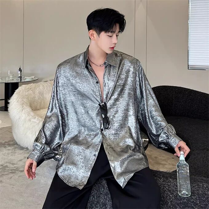 メンズシャツ 長袖 シャツ メンズ 高級感 オシャレ ゆったり 無地 シングル 折り襟 光沢感 スタイリッシュ ストリート かっこいい ダンスウェア クラブ ナイトライフ バー パーティー シャイニー ストレート カジュアル メンズファッション 春 夏 夏服 送料無料