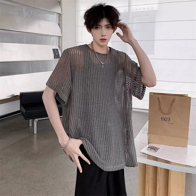 半袖tシャツ Tシャツ メンズ 透かし編み カットソー メッシュニット シアートップス 半袖 ショート丈 クルーネック 個性的 透け感 涼しい 重ね着 コーデ ゆったり おしゃれ アメカジ カジュアル ファッション ストリート かっこいい 夏 夏服 送料無料