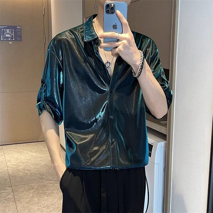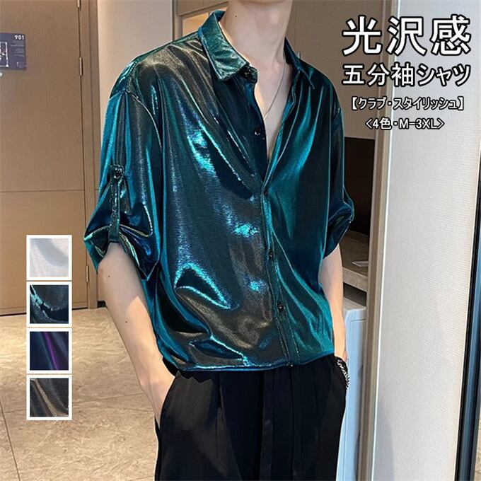 メンズシャツ 五分袖 シャツ メンズ 高級感 光沢感 個性的 オシャレ ゆったり 無地 シングル 折り襟 ストリート かっこいい サマーウェア クラブ ナイトライフ バー パーティー シャイニー ストレート カジュアル メンズファッション 夏 夏服 送料無料