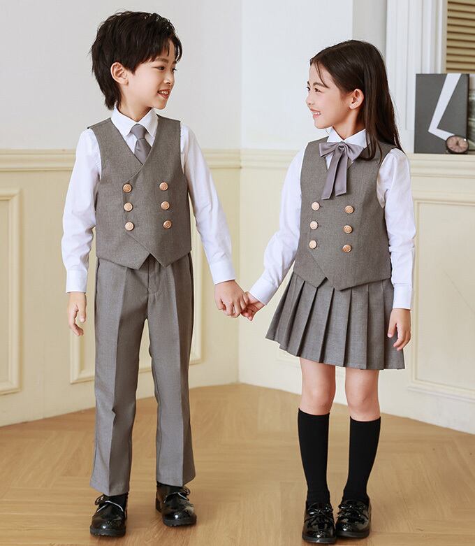 ■セット内容:男の子5点セット(ベスト+シャツ+ズボン+ネクタイ+ワッペン) 女の子5点セット(ベスト+シャツ+スカート+蝶ネクタイ+ワッペン)