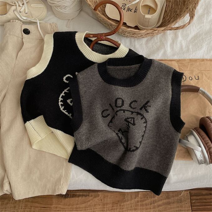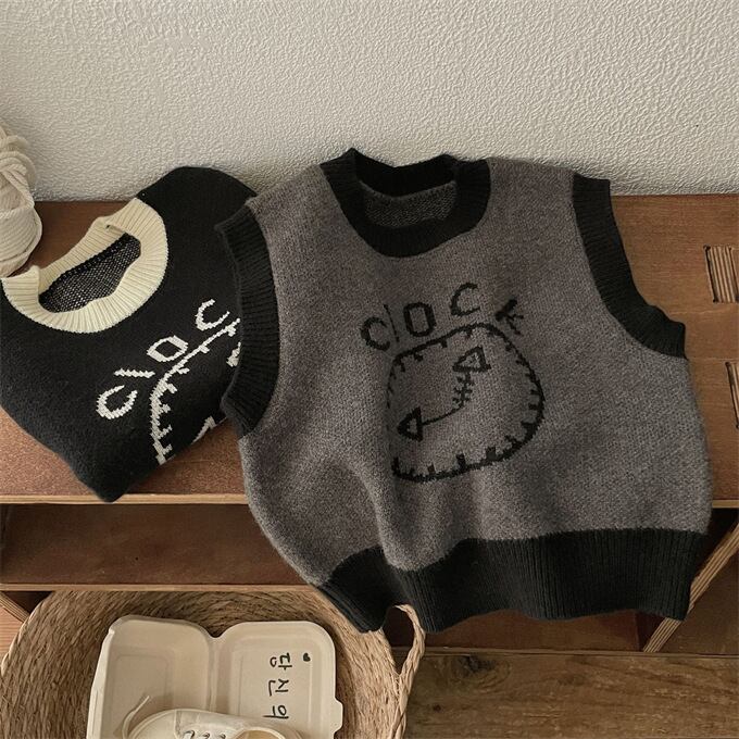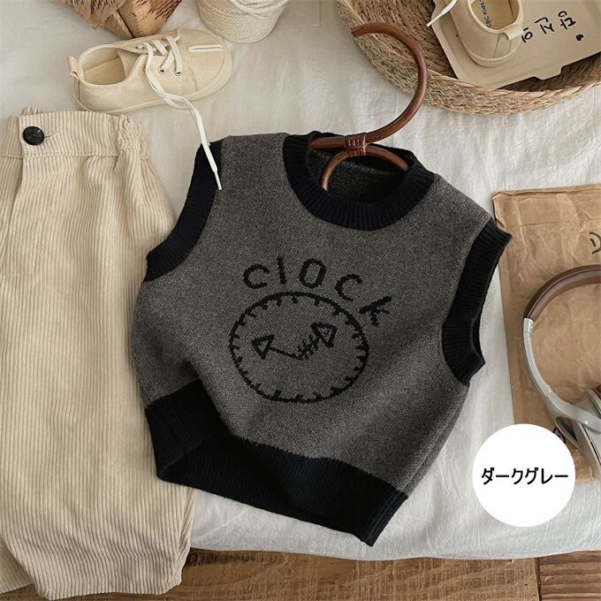 ベスト 子供 ニットベスト クルーネック 女の子 男の子 ニットトップス キッズ ベスト 春秋 時計柄 ジャカード 色切替 かわいい カジュアル プルオーバー 子供服 トップス キッズファッション 小学生 通園 通学 ジュニア 上着 普段着 お出かけ おしゃれ 春 秋 秋冬 送料無料