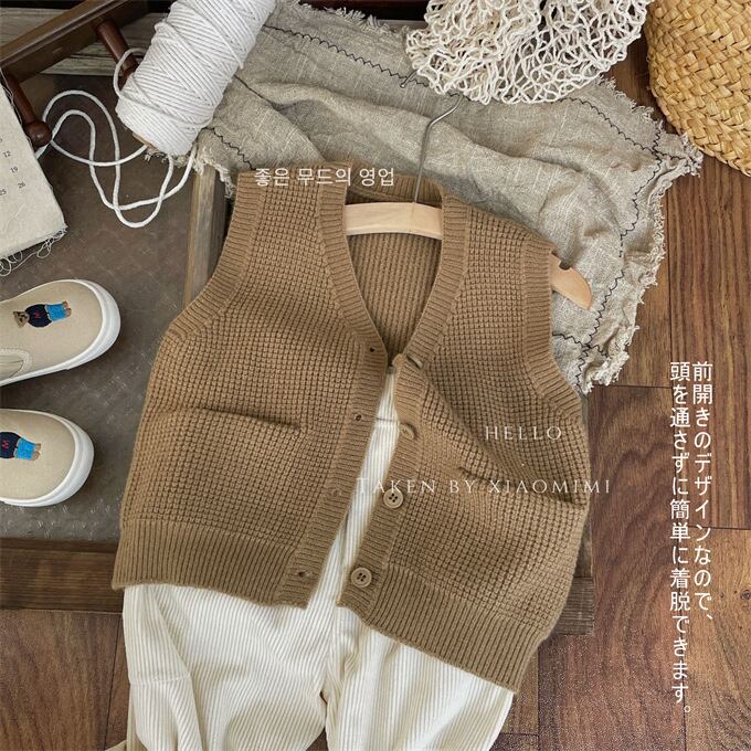 ベスト キッズ ニット 前開き 女の子 男の子 Vネック 子ども ジュニア トップス ワッフル 羽織 ライトアウター フロントボタン シングル ポケット シンプル 無地 重ね着 春秋 定番 小学生 通園 通学 上着 普段着 お出かけ ベーシック 春 秋 秋冬 送料無料
