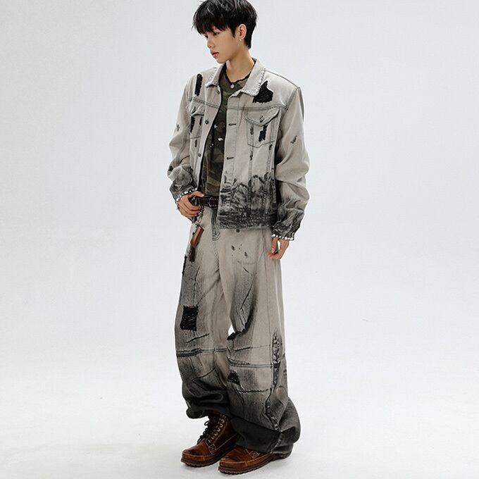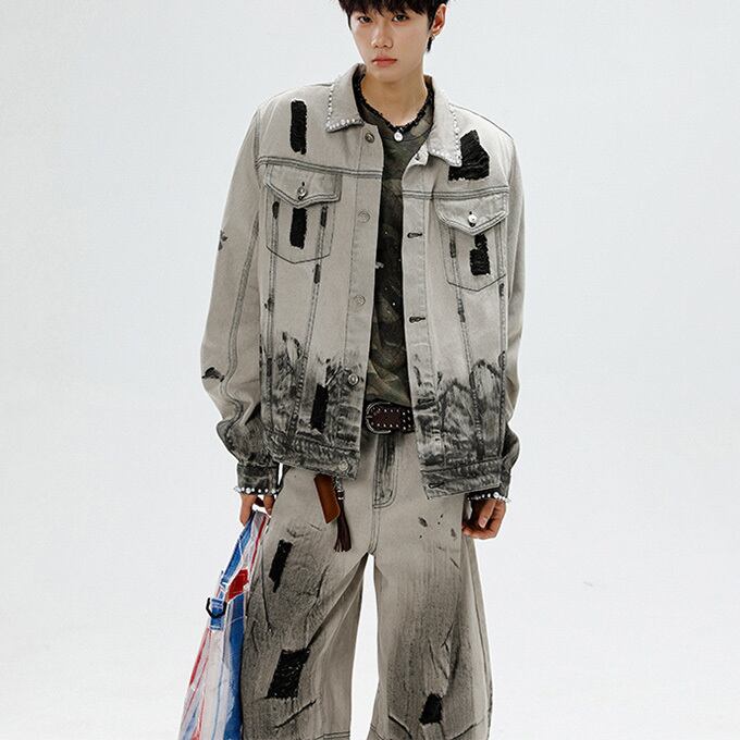 2点セット デニムセットアップ メンズ 上下セット Gジャン デニムジャケット デニムパンツ 真珠付き ワイドパンツ ゆったり セットアップ メンズファッション 男性 秋 秋冬 ヴィジュアル系 お兄系 大人 送料無料