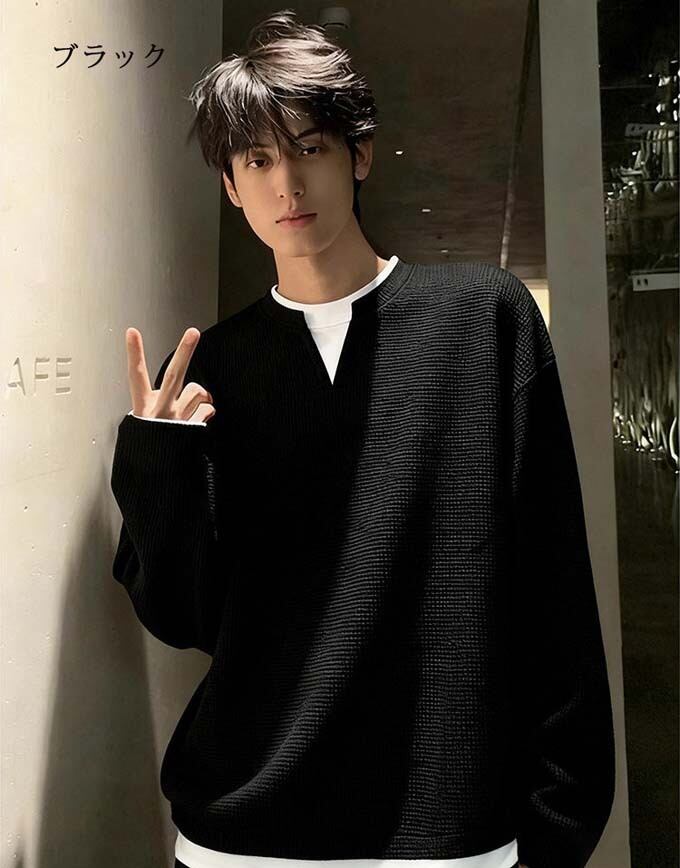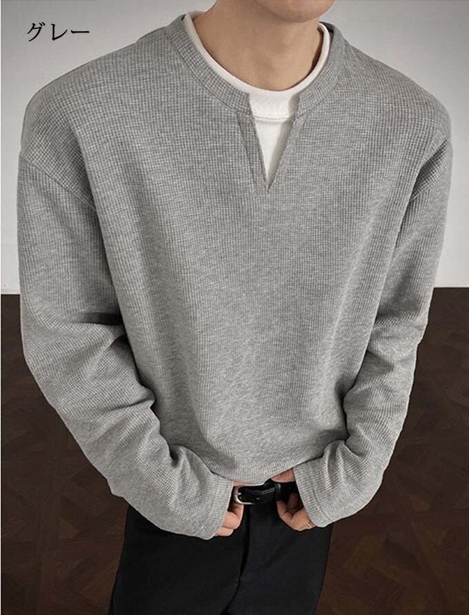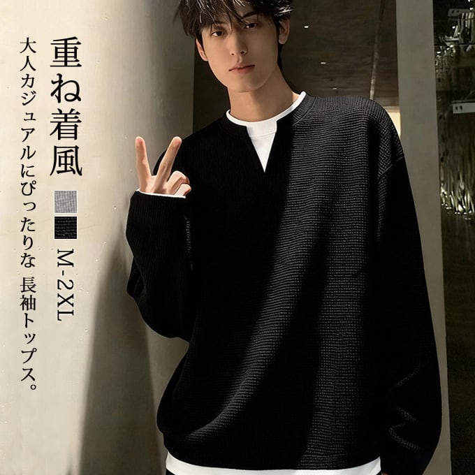 長袖Tシャツ メンズ 重ね着風 レイヤード ワッフル編み tシャツ キーネック ショート丈 プルオーバー トップス 無地 シンプル ゆったり 快適 デイリー使い 日常着 カジュアル ストリート かっこいい 大人 20代 30代 40代 春 秋 春秋 ファッション 送料無料