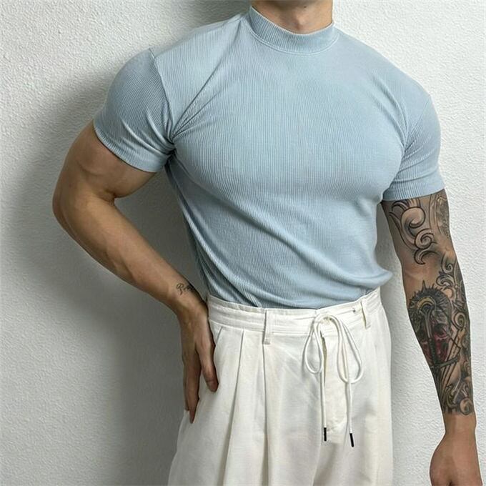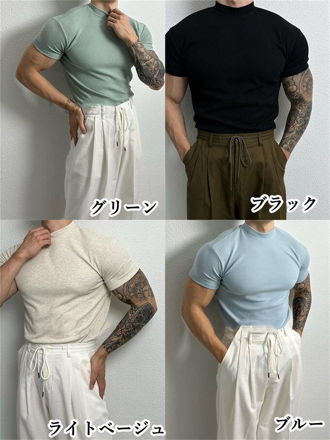 半袖tシャツ メンズ tシャツ タートルネック 無地 リブ編み トップス インナー スポーツ トレーニング 高弾性 ストレッチ 細身 タイト スリム ファッション カジュアル 通学 通勤 夏物 送料無料