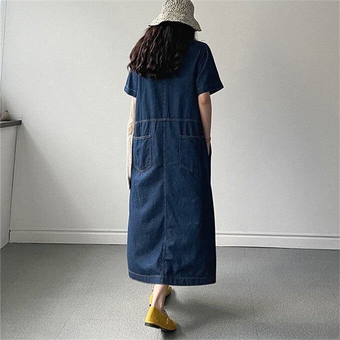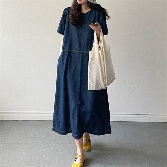 デニムワンピース 半袖 レディース ロング丈 クルーネック 配色ステッチ ポケット付き ビッグシルエット プルオーバー 無地 レトロ 着瘦せ 柔らかい シンプル 韓国ファッション カジュアル お出掛け 日常着 通勤 20代 30代 40代 上品 夏 夏服 送料無料