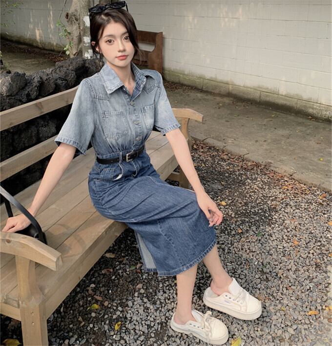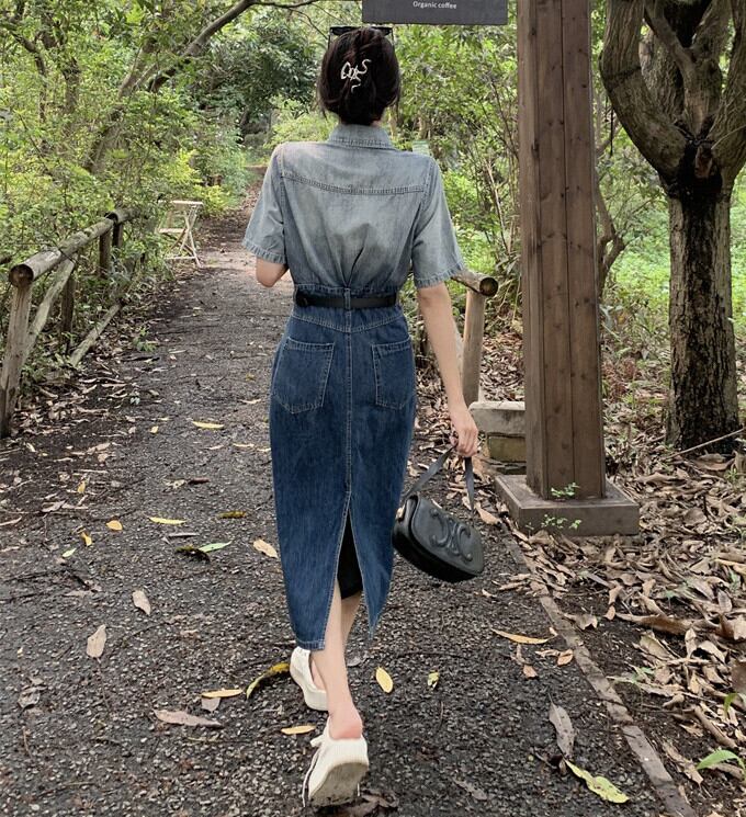 デニムワンピース 半袖 レディース ロング丈 折り襟 グラデーション ポケット付き スリム チュニック フロントスリット ヴィンテージ風 オシャレ きれいめ 韓国ファッション フェミニン お出掛け オフィスカジュアル 通勤 20代 30代 40代 上品 夏 夏服 送料無料