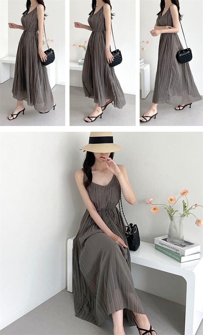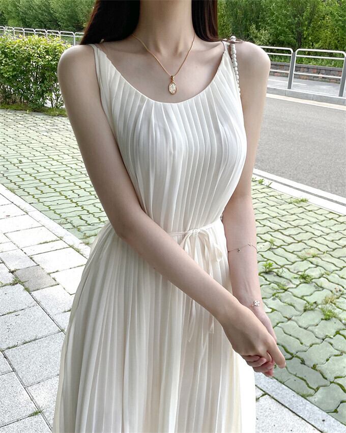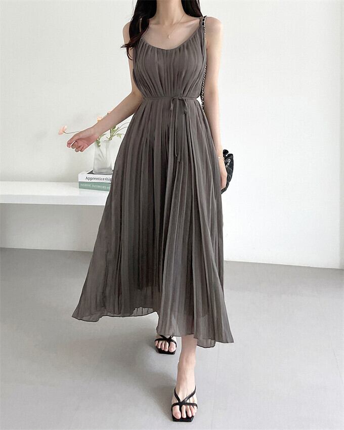 プリーツワンピース レディース キャミワンピース ロング丈 マキシワンピ 無地ワンピース エレガント ストラップ調整可能 ゆったり 体型カバー リボン付き シンプル きれいめ オシャレ フェミニン ビーチ リゾート 通勤 20代 30代 40代 夏 夏服 送料無料