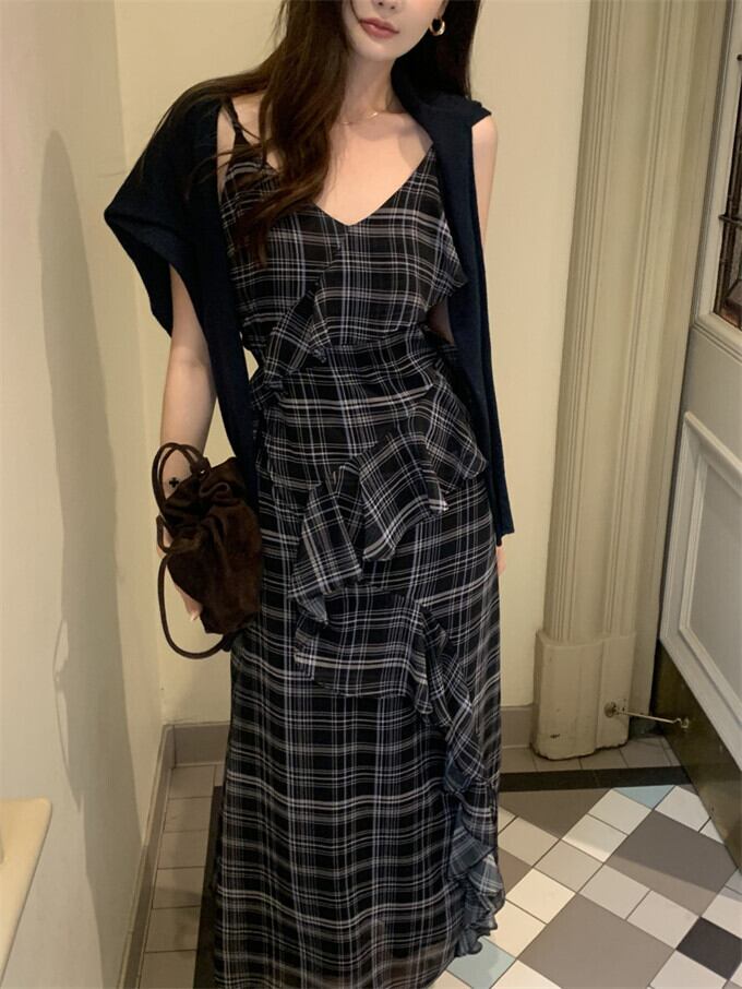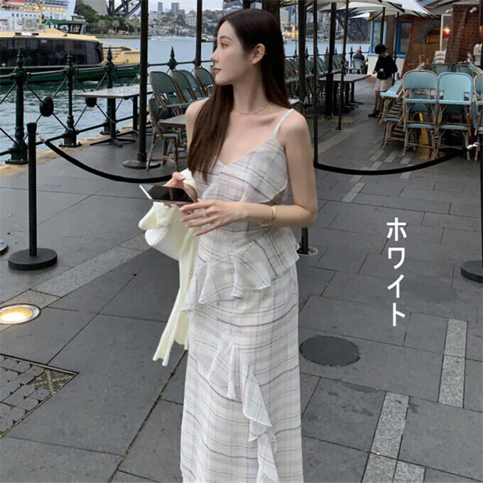 チェックワンピース レディース キャミワンピース ロング丈 イレギュラー フリル マキシワンピ チェック柄 Vネック フェミニン ストラップ調整可能 チュニック きれいめ オシャレ ビーチ リゾート 韓国ファッション 20代 30代 40代 夏 夏服 送料無料