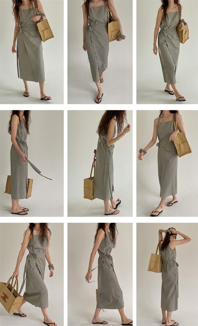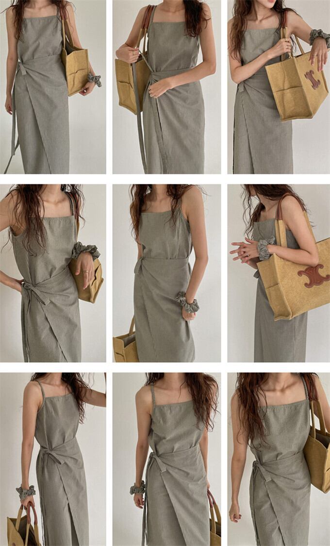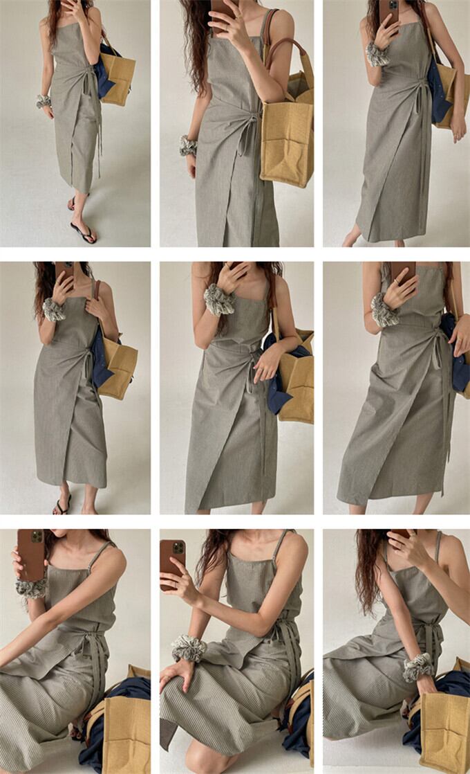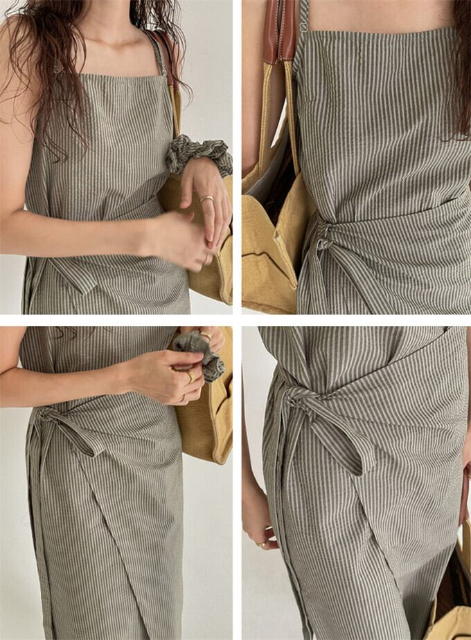 ストライプワンピース レディース シュシュ付き キャミワンピース ロング丈 ワンピ スクエアネック ウエストリボン付き イレギュラー ストラップ調整可能 チュニック きれいめ オシャレ オフィスカジュアル 韓国ファッション 20代 30代 夏 夏服 送料無料