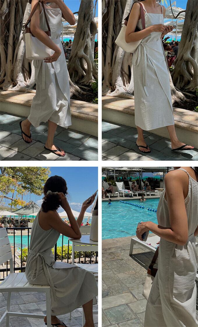 一枚でサマになる、スクエアネックのリボン付きロングワンピース。