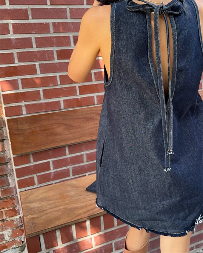 ノースリーブワンピース レディース キャミワンピース ミニ丈 ワンピ デニムスタイル ショート丈 夏ワンピース Aライン 無地 バックレス バックリボン ポケット付き 低身長向け 脚長効果 きれいめ オシャレ 韓国ファッション 20代 30代 夏 夏服 送料無料