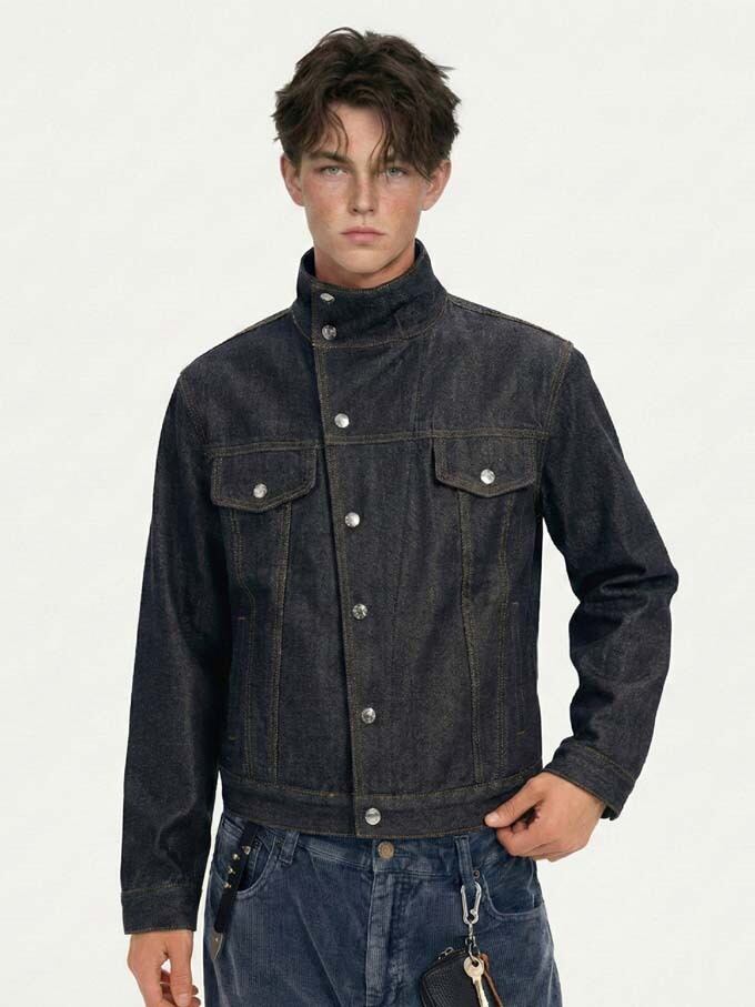 シンプルなデザインに拘りを持たせた、メンズ向けスタンドカラーデニムジャケットです。<br>