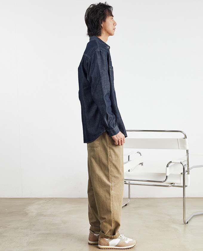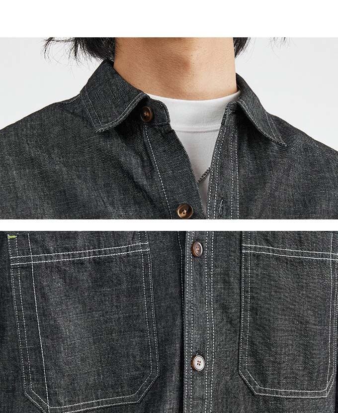 ワークウェアをベースにしたデニムシャツ、ダブル胸ポケットとカラーステッチがデザインのアクセント<br>