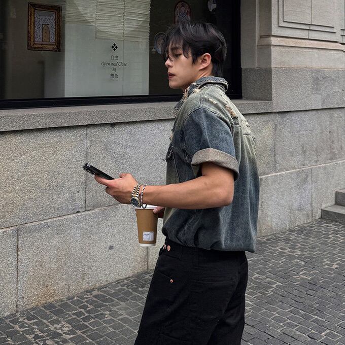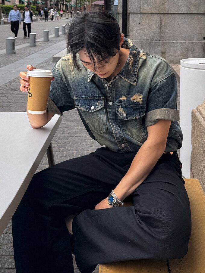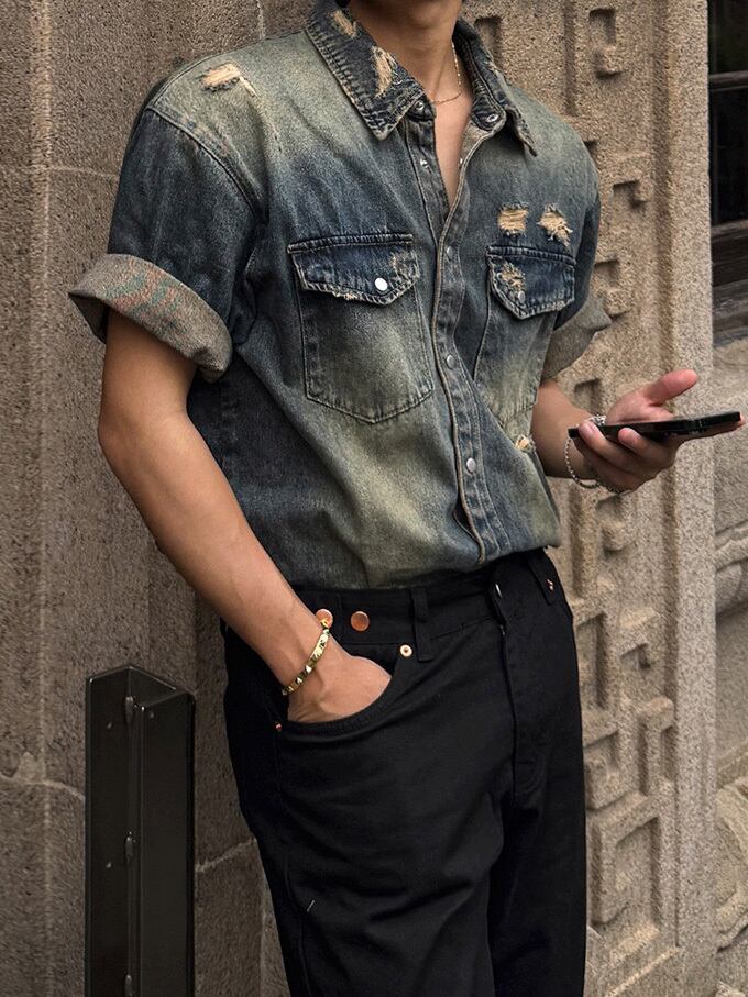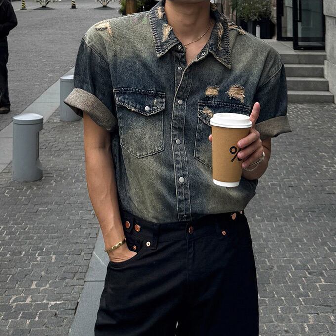 ダメージ加工とヴィンテージウォッシュで際立つ半袖デニムシャツ。