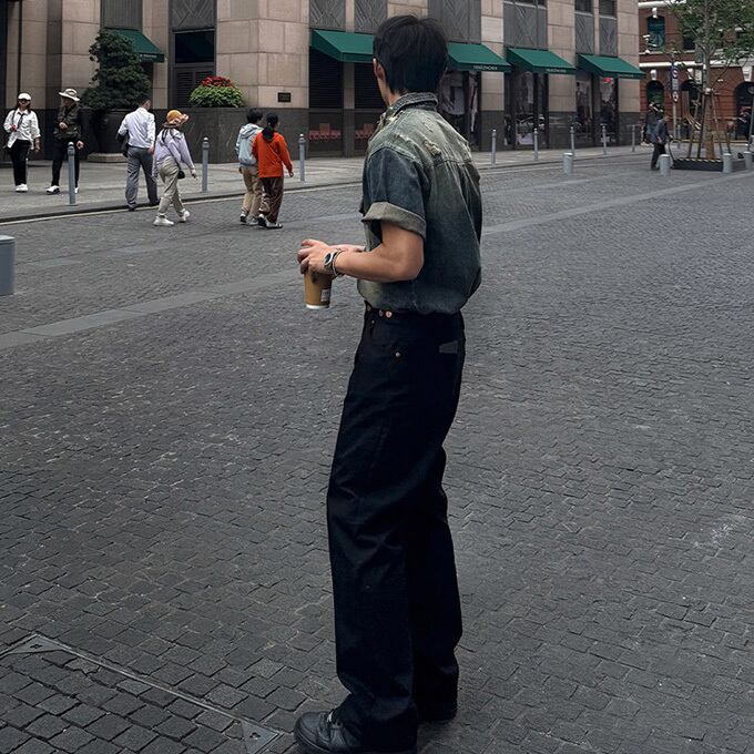 襟や胸元のカジュアルなダメージがストリート感を演出し、オーバーサイズシルエットで春夏のコーデに抜群の存在感を与えます。