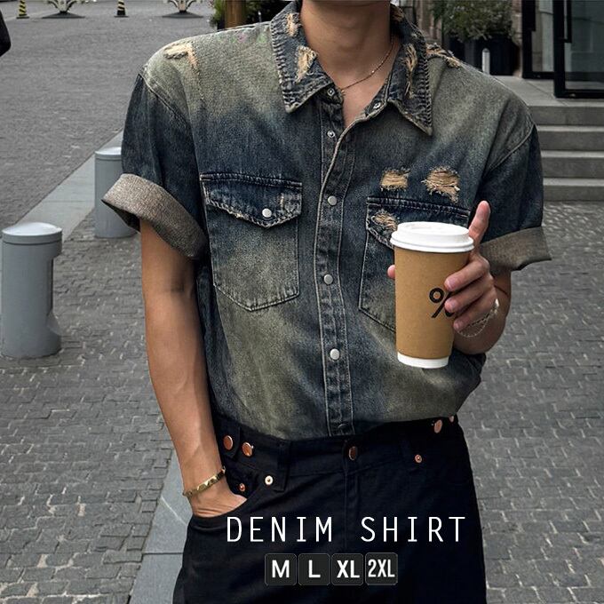 半袖デニムシャツ メンズ ダメージデニムシャツ ヴィンテージ加工 半袖シャツ デニムシャツ 胸ポケット ジーンズシャツ カジュアルシャツ 20代 30代 40代 男 男性 夏 春 夏服 韓国ファッション 送料無料