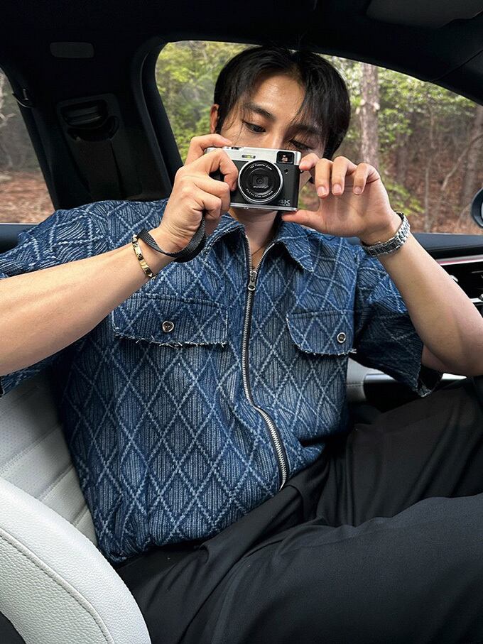 ダイヤ柄ジャカード織りのデニム素材を使用した、ジップアップ仕様の半袖シャツ。