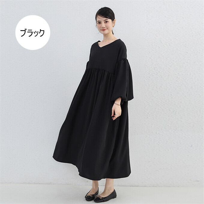 胸元のギャザーが立体感を加え、ルーズなマキシ丈がお尻や太ももをカバーし、体型を気にせず着用できます。<br>