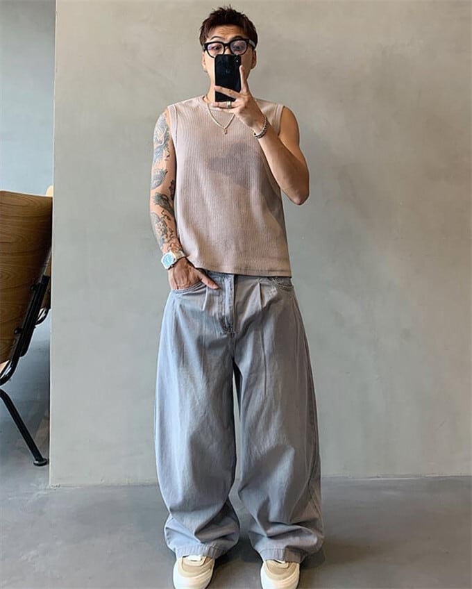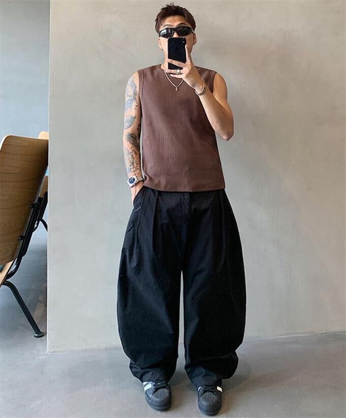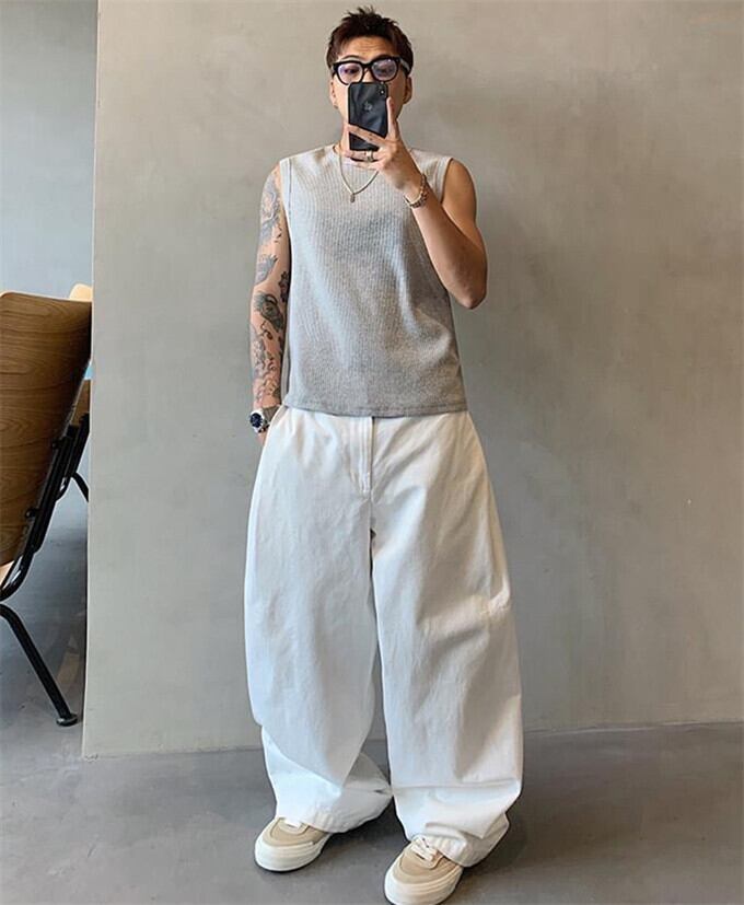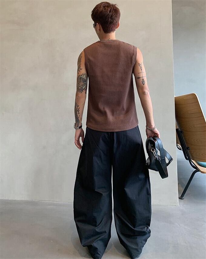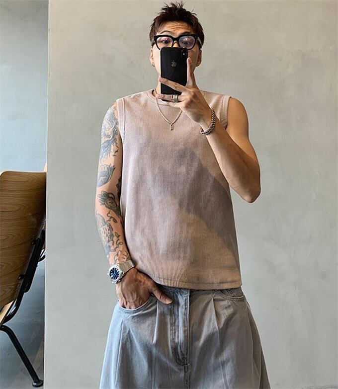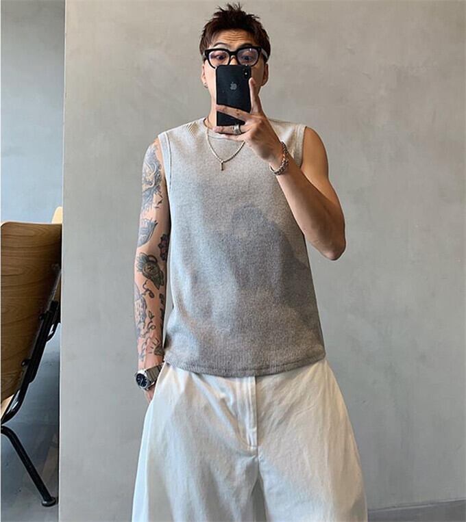 シンプルで着回し力抜群の、メンズ用リブニットタンクトップです。