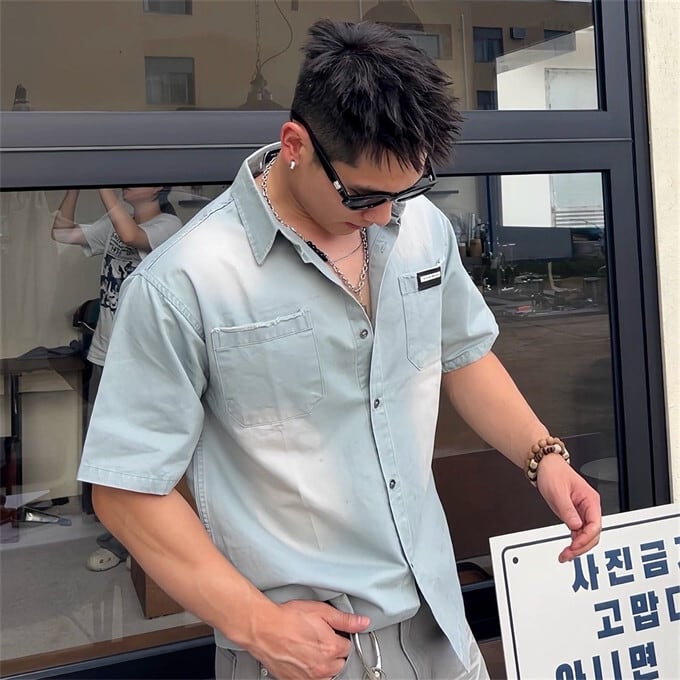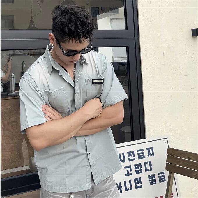 シャツ メンズ 半袖 ウォッシュ加工 ワークシャツ シングル 前開き オーバーサイズ ネクタイ付き ゆったり ヴィンテージ風 夏 トップス カジュアル ストリート 大きいサイズ おしゃれ かっこいい 通学 夏服 送料無料