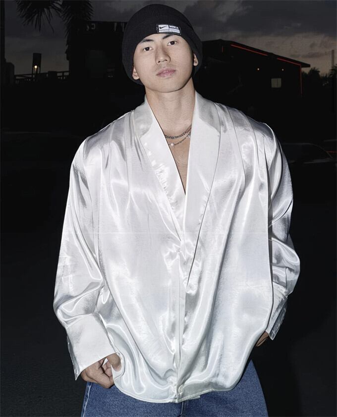 光沢感のあるサテンで高級感を纏う、ゆったりとしたオーバーサイズの長袖シャツです。