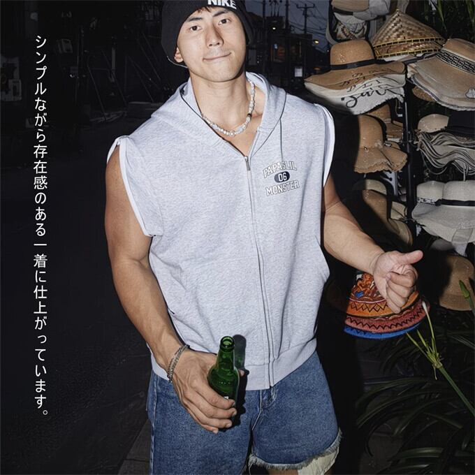 旬なストリートスタイルを演出する、メンズ用フード付きノースリーブジップベストです。