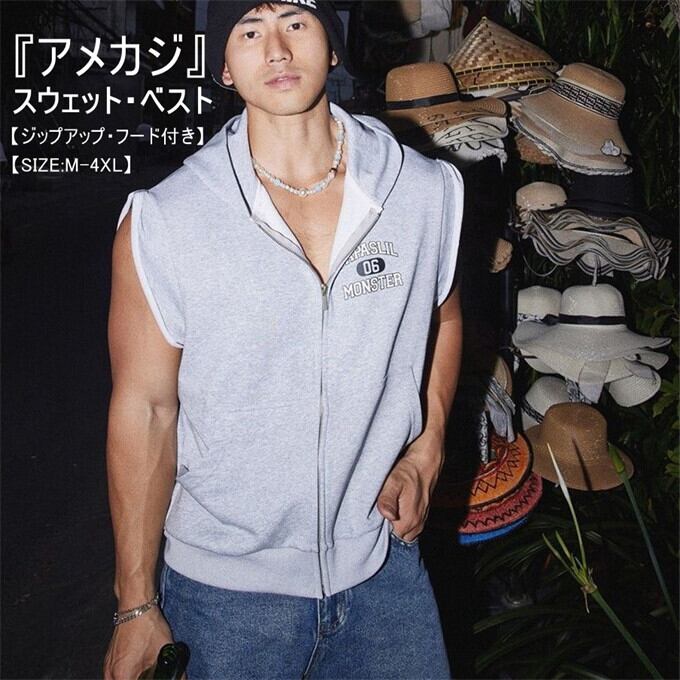 ベスト メンズ フード付き ノースリーブ ジップアップ スウェット ロゴ付き ポケット付き ストリート カジュアル 春夏 アウター ゆったり 大きいサイズ ジム アウトドア レイヤード 春服 夏服 送料無料