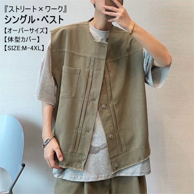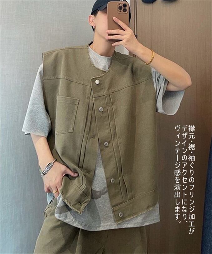 ワークベスト メンズ ノーカラー 裾フリンジ シングル 前開き 羽織り レイヤード 重ね着 レトロ ヴィンテージ風 胸ポケット ストリート カジュアル 春 夏 アウター ゆったり 体型カバー 大きいサイズ 春服 夏服 送料無料