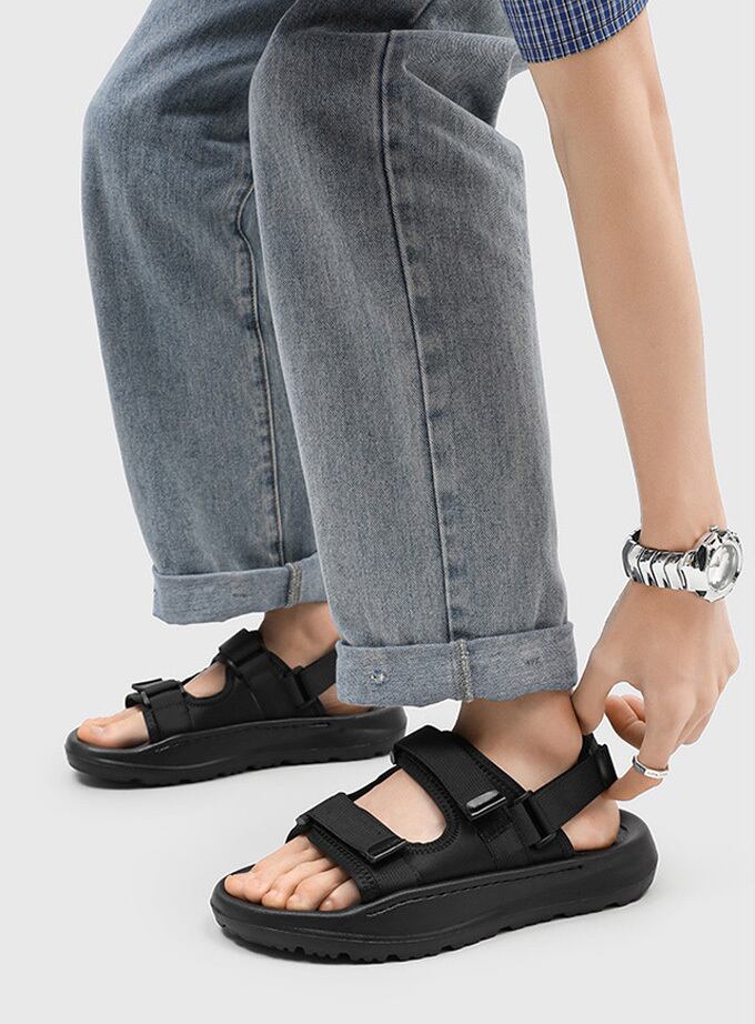 厚底プラットフォームソールが足元をスタイルアップし、マジックテープストラップでフィット感を自由に調整可能。<br>