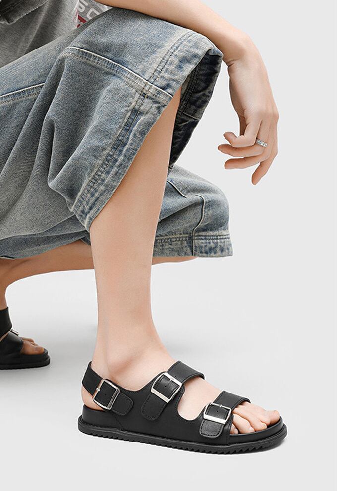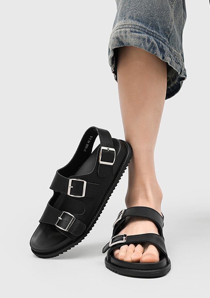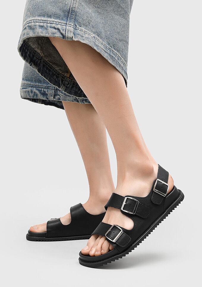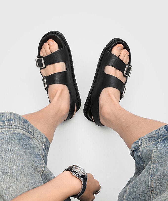 ダブルストラップと金属バックルのデザインが洗練された印象を与え、厚底ソールが足元をスタイルアップ。<br>