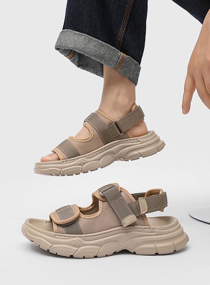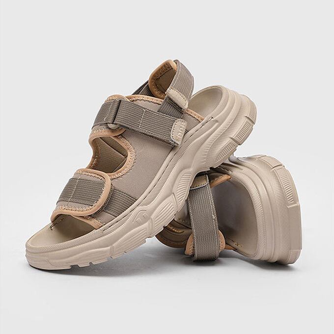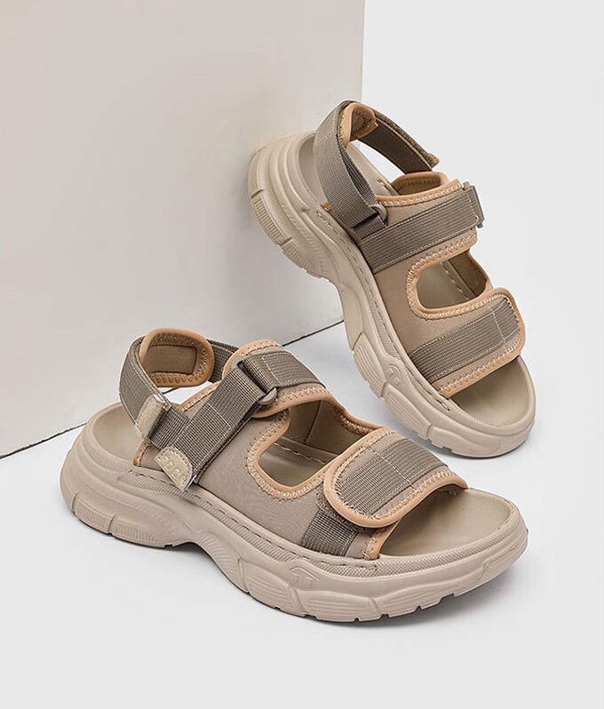 厚底プラットフォームソールが足元をスタイルアップし、マジックテープストラップでフィット感を自由に調整可能。<br>