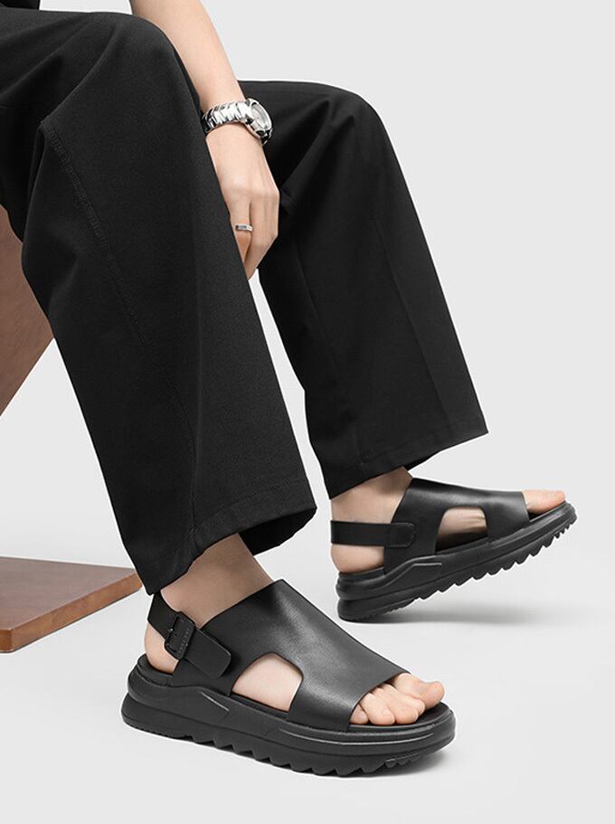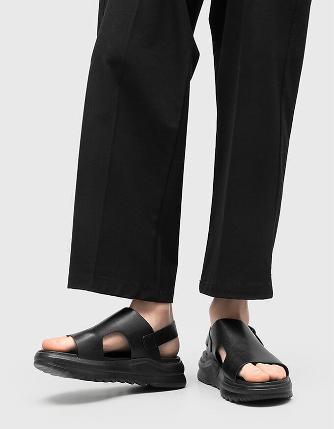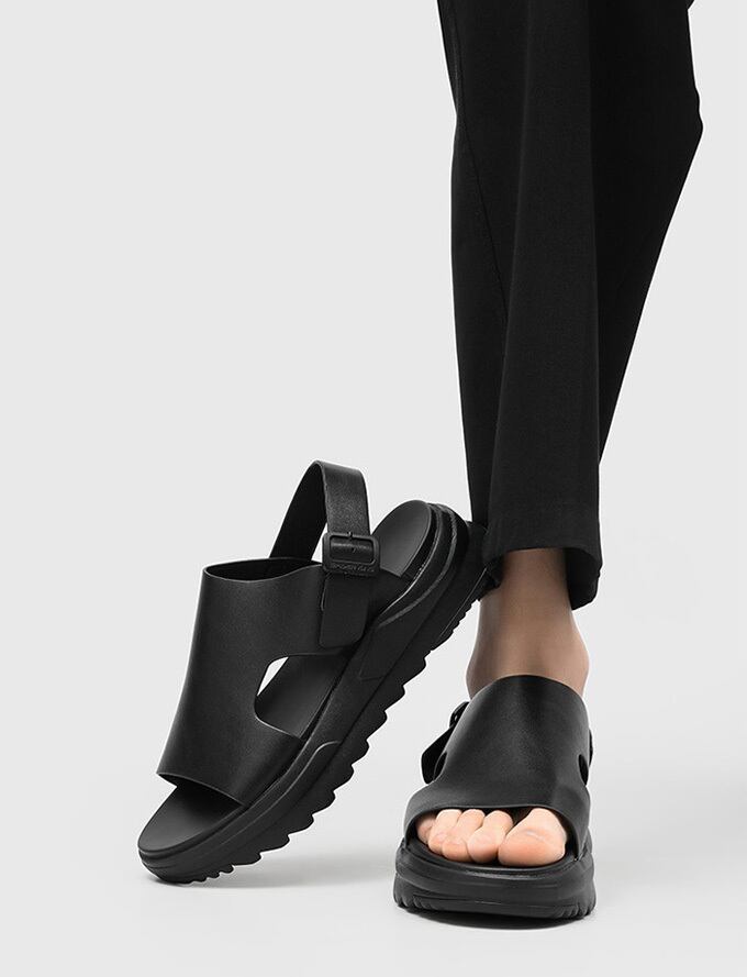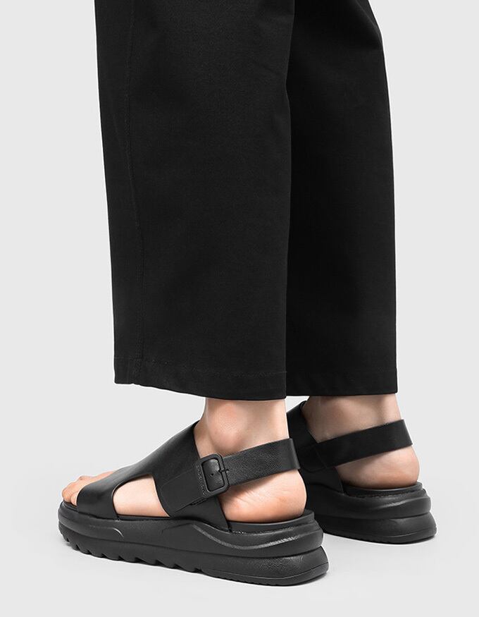 厚底デザインが足元をスタイルアップし、バックストラップでフィット感を調整可能。<br>