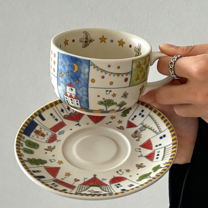 ◆ 手描き風の可愛いイラストが魅力のカップ&ソーサーセット 月や星、お家、木、動物たちが描かれた、まるで絵本のようなデザイン。 シンプルな白地にカラフルなイラストが映え、毎日のカフェタイムを楽しく彩ります。 大人の方はもちろん、お子様用の食器としてもおすすめです。