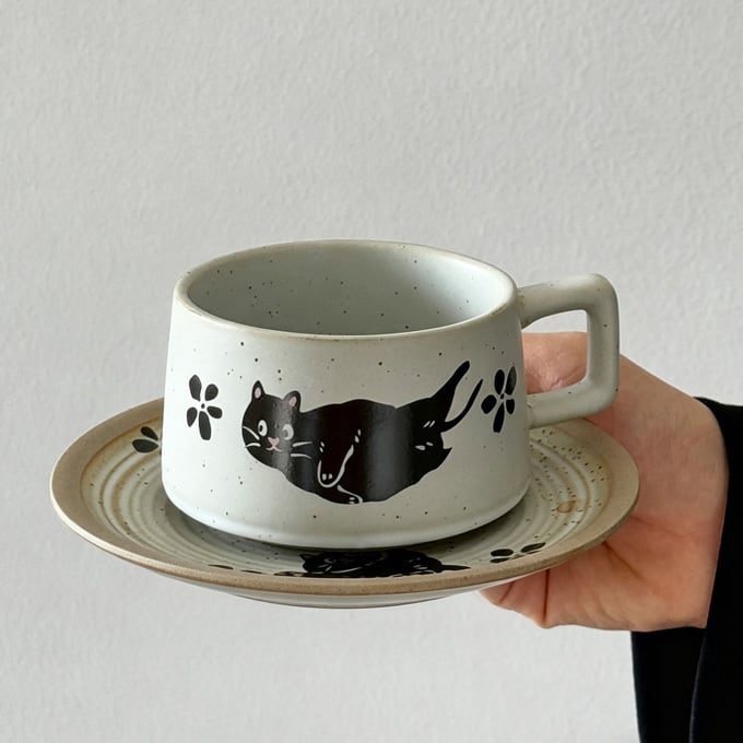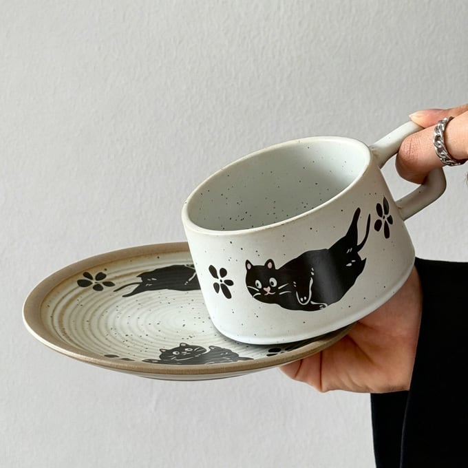 ◆ 黒猫イラストが魅力的なカップ&ソーサーセット 遊び心ある黒猫のデザインが、毎日のカフェタイムを楽しく彩ります。 レトロ調の砂目調素材と組み合わさった、大人かわいい雰囲気が特徴で、 猫好きさんにはたまらない一品です!