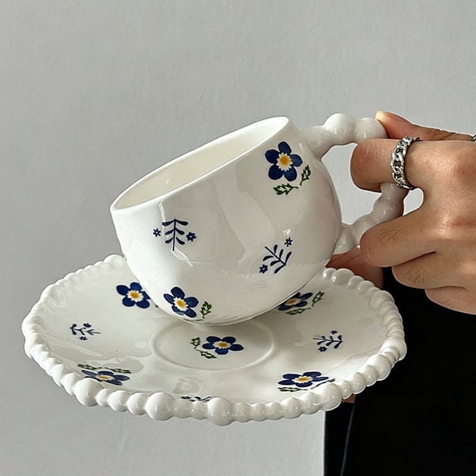 繊細な手描き風の花柄が、毎日のティータイムやコーヒーブレイクを華やかにします。