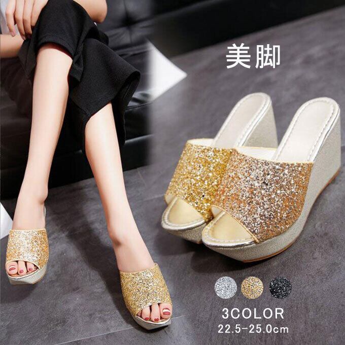 厚底サンダル ウェッジソール レディース ラメ ミュールサンダル グリッター ハイソール ミュール キラキラ