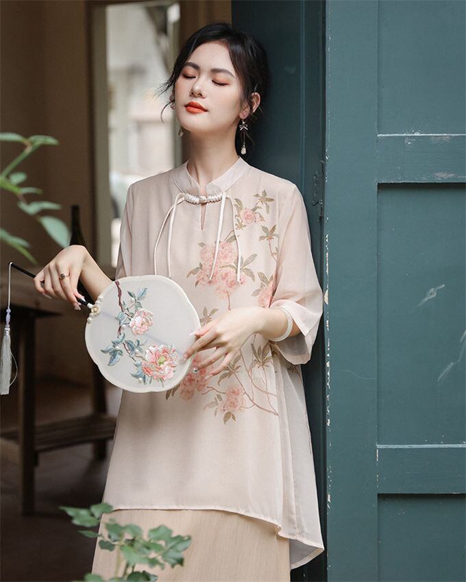 チャイナワンピース ロングワンピース レディース 花柄 チャイナドレス 薄手 五分袖 重ね着風 レイヤード風 ロング丈 ミモレ 大人 可愛い 通勤 カジュアル ゆったり 着痩せ おしゃれ 夏 新作 送料無料