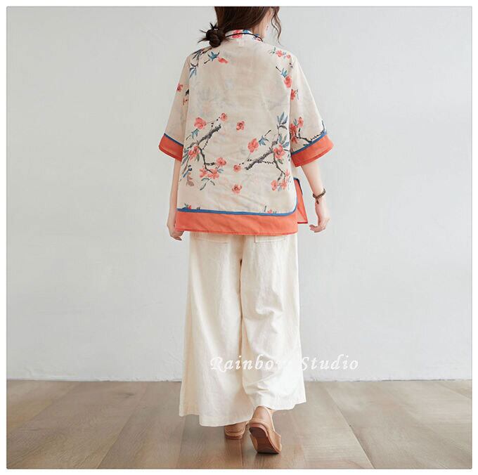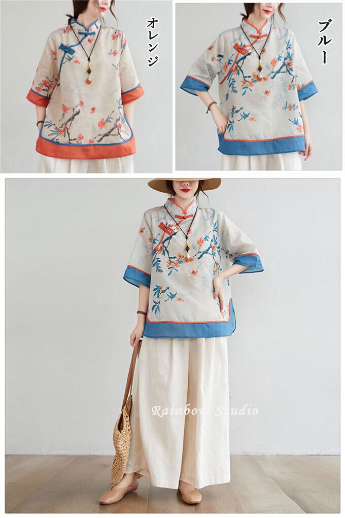 シャツブラウス レディース 立ち襟 斜めボタン 5分袖 チャイナ風 プリント プルオーバー レトロ ゆったり 体型カバー 着痩せ おしゃれ 夏 新作 プリント 送料無料