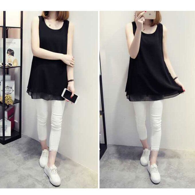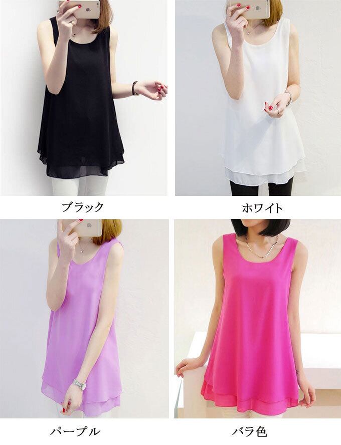 タンクトップ シフォン Aライン フレア トップス レディース ノースリーブ ブラウス ロング丈 無地 ラウンド襟 2枚重ね 透けない オシャレ 夏 送料無料