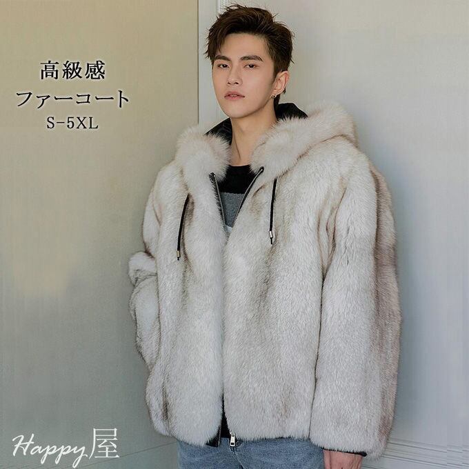 ファーコート メンズ 毛皮コート フォクス フェイクファー フード付き 厚手 防寒 防風 大きいサイズ コート 柔らかい 上着 ジャケット 高級感 アウター 秋冬 新作 送料無料