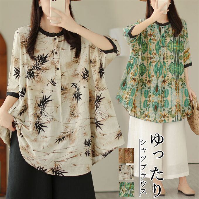 シャツブラウス レディース リネン プルオーバー プリント 七分袖 トップス ゆったり 体型カバー 着痩せ おしゃれ カジュアル 通学 通勤 上質 ファッション レトロ 夏 送料無料