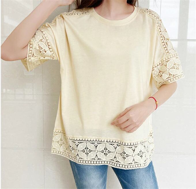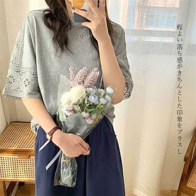 Tシャツ レディース ラウンドネック トップス プルオーバー 五分袖 レース切り替え 透かし彫り ゆったり 体型カバー 着痩せ フォーマル 通勤 オフィス カジュアル きれいめ 夏 送料無料