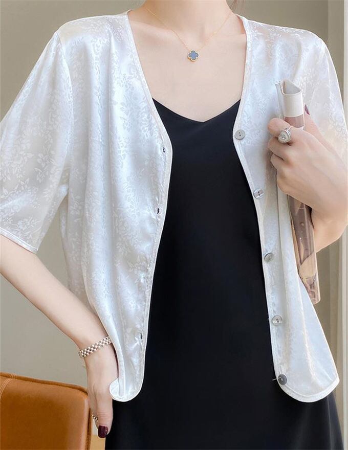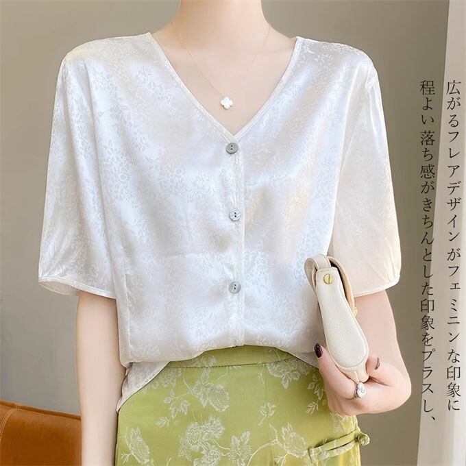 シャツブラウス レディース Vネック シングル トップス サテン調 カーディガン 前開き 羽織り アウター ゆったり 着痩せ オフィス 通勤 OL 着痩せ ファッション 夏物 送料無料