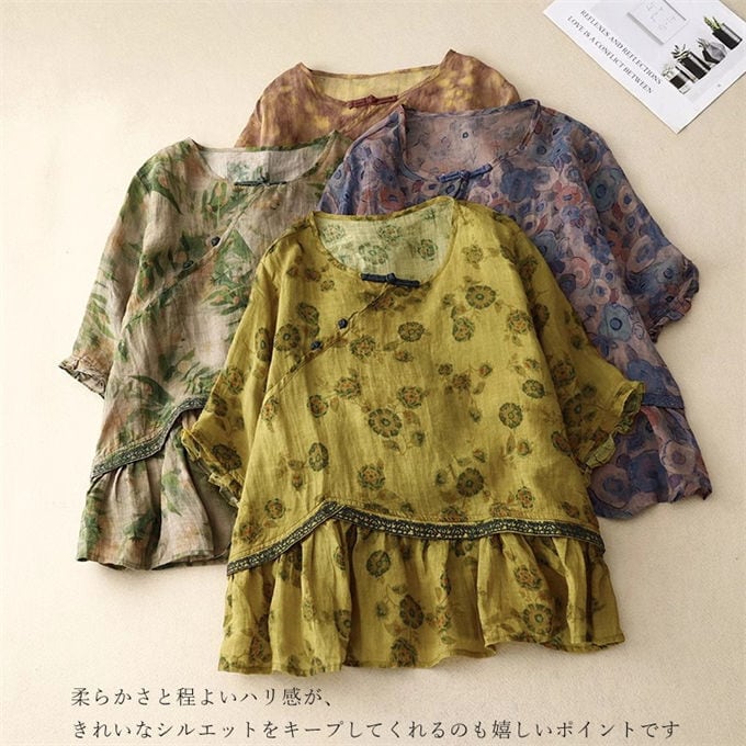 リネンシャツ レディース 七分袖 花柄 チャイナ風 斜めボタン チャイナトップス サマーブラウス プリント ゆったり 体型カバー 薄手 エレガント カジュアル 夏 送料無料
