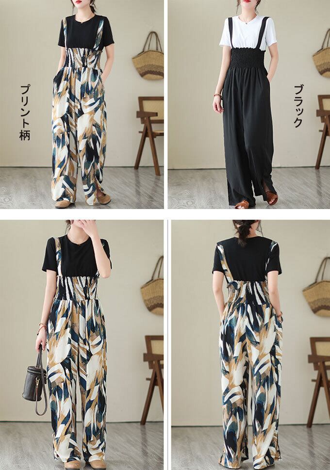 幅広 ワイドパンツ ワイドサロペット レディース ゆったり 体型カバー ガウチョ オールインワン スリット キャミ サロペット ワイドパンツ ガウチョ スカンツ 無地 シンプル カジュアル キレイめ 春 夏 送料無料