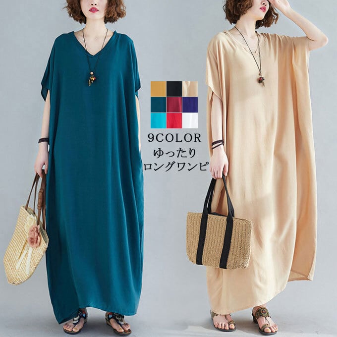 ワンピース ロングワンピース レディース Vネック 半袖ワンピース 無地 綿混 カジュアル 体型カバー ゆったり楽ちん 大きいサイズ 春夏 新作 送料無料